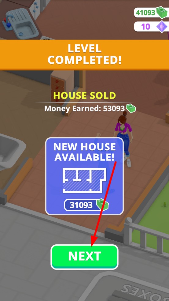 3、积累资金后挑战复杂户型,尝试更加复杂的风格设计,提升房屋溢价率,卖房后点击NEXT解锁更大型潜力房源。