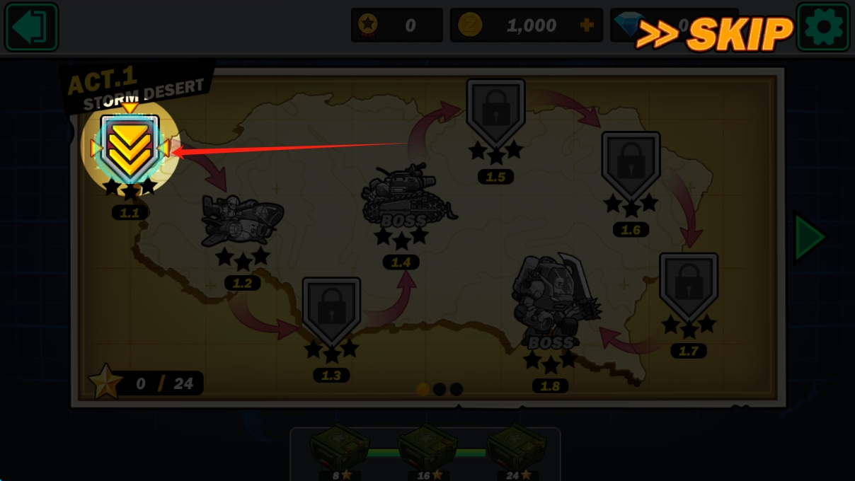 2、在关卡选择界面,点击ACT.1STORMDESERT下的1.1关卡,开启战斗任务,点击选择关卡。