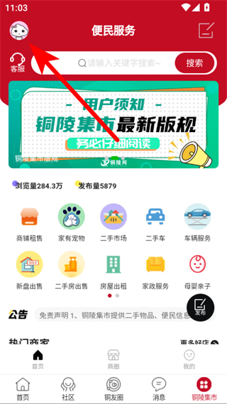 1、打开铜陵网APP,点击左上角头像,进入个人中心页面。