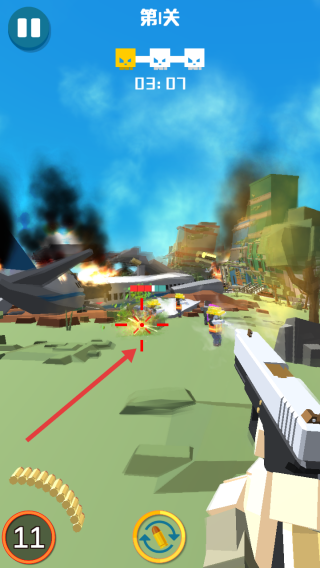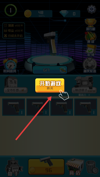 1、在游戏主界面,点击黄色开始游戏第1关按钮,进入射击战斗关卡开启第一关挑战。