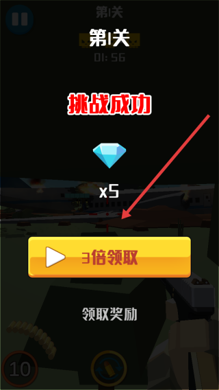 3、成功通关第1关后,出现挑战成功提示,可点3倍领取获更多奖励或选领取奖励继续下一关。