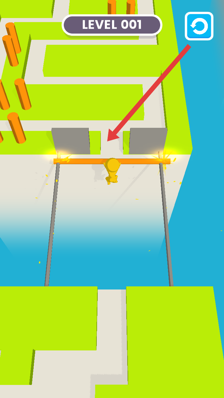 1、在LEVEL001中,操控黄色角色借助收集木材的长杆跨越下方缺口,沿着前面的通道继续前进。