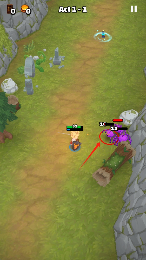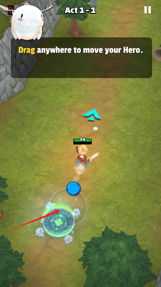1、游戏开局,按提示拖动屏幕任意位置,控制英雄向绿色光圈处移动,开启Act-1-1关卡冒险。
