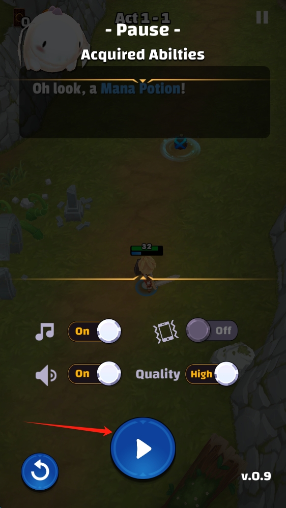 3、暂停界面可调整音乐、音效等设置,确认后点击蓝色播放按钮,继续Act-1-1关卡的探索战斗。