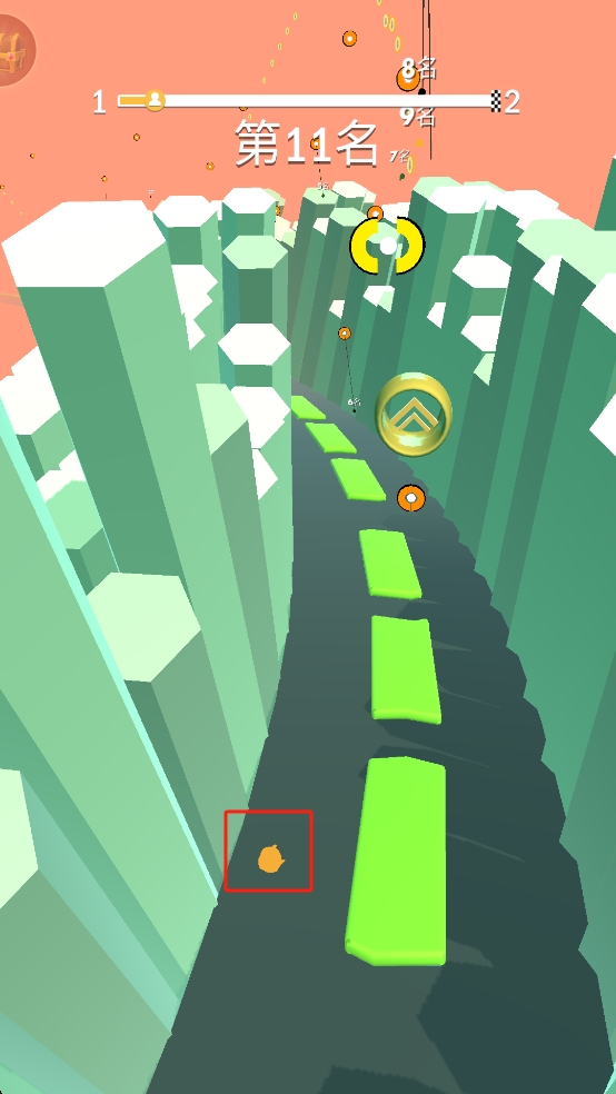1、操控小球沿赛道滚动,避开两侧障碍,拾取橙色光点,通过黄色圆环道具时注意时机,提升排名。
