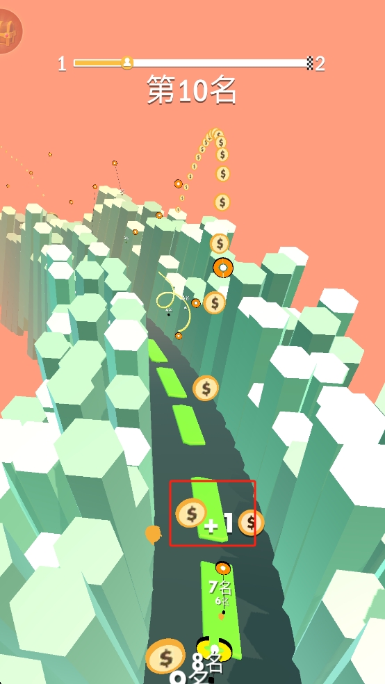 2、这里我们需要引导小球冲向绿色的平台,并收集沿途的金币,借助金币群加速,超越前方对手。