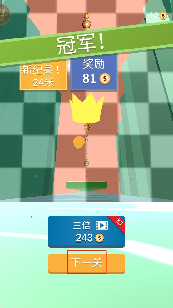 3、夺冠后点击下方的下一关按钮,开启新赛道挑战,积累金币可解锁增益,继续冲击更高名次与记录。