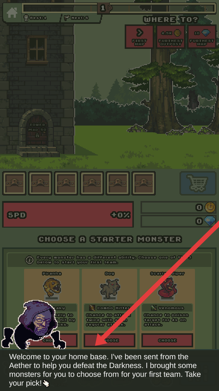 2、在选择初始怪物界面,点击CHOOSE按钮对应犬类怪物,其能力为连击攻击,选定初始怪物,组建首支冒险队伍。