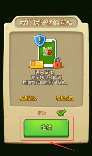 2、点击红框绿色继续按钮,同意隐私条款进入游戏。