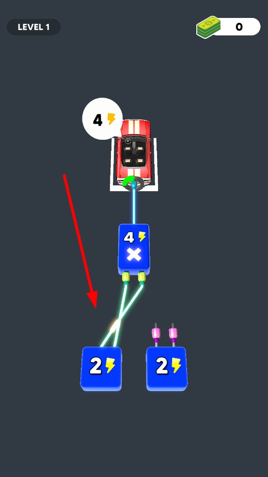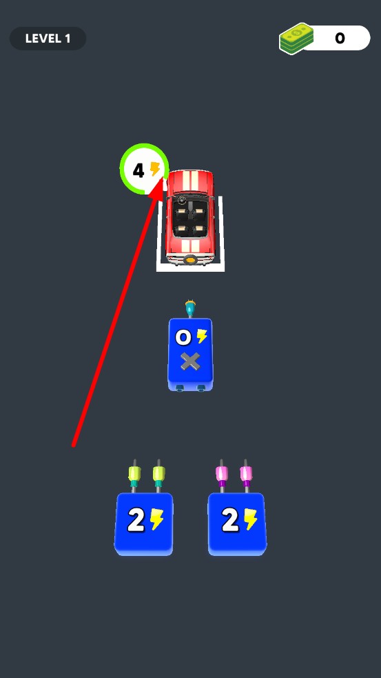1、观察汽车头顶的电力需求、下方电源模块的电力值及接口颜色,中间转换器初始显示O或X,代表运算模式。