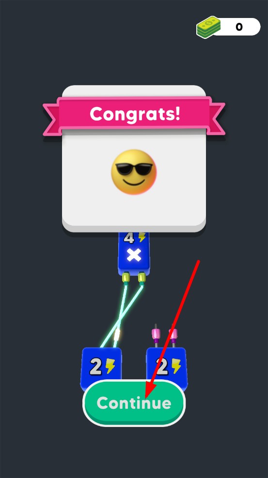3、当电力总和匹配且接口颜色对应后,汽车成功充电,界面弹出Congrats!,点击Continue按钮进入下一关。