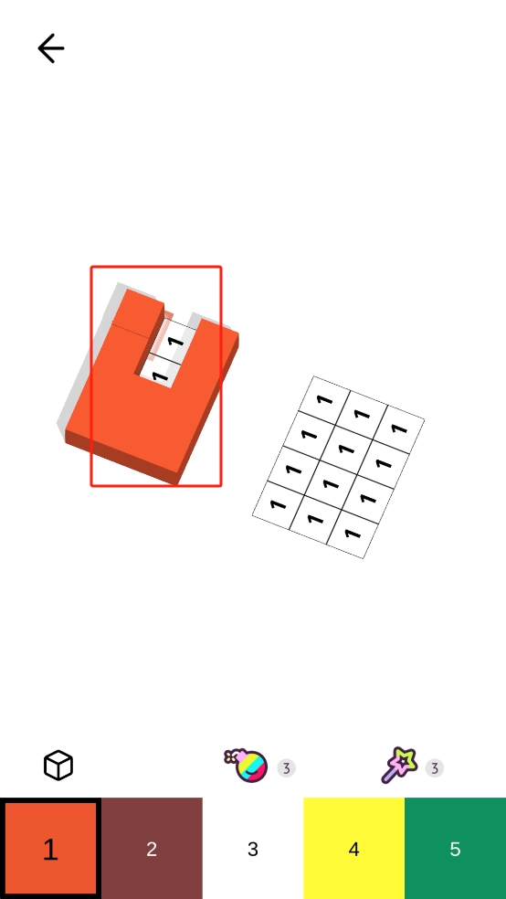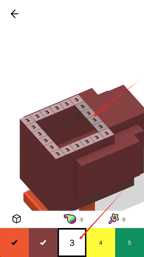 3、切换到颜色3的方块,依据棕色区域数字3提示,将方块拖入对应位置,填满该区域,推进关卡的进程。