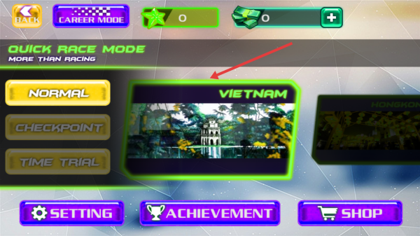 1、在游戏模式选择页,进入QUICK RACE MODE,选VIETNAM赛道,点击确认进入该赛道竞速。