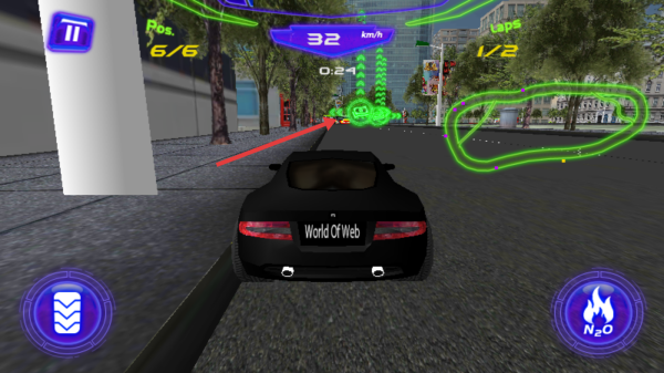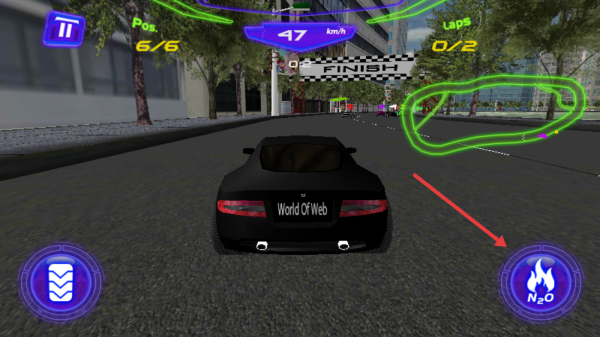 2、驾驶黑色赛车World Of Web在赛道行驶,遇绿色标记区域,按需点击右下角N₂O按钮加速,提升跑圈效率。