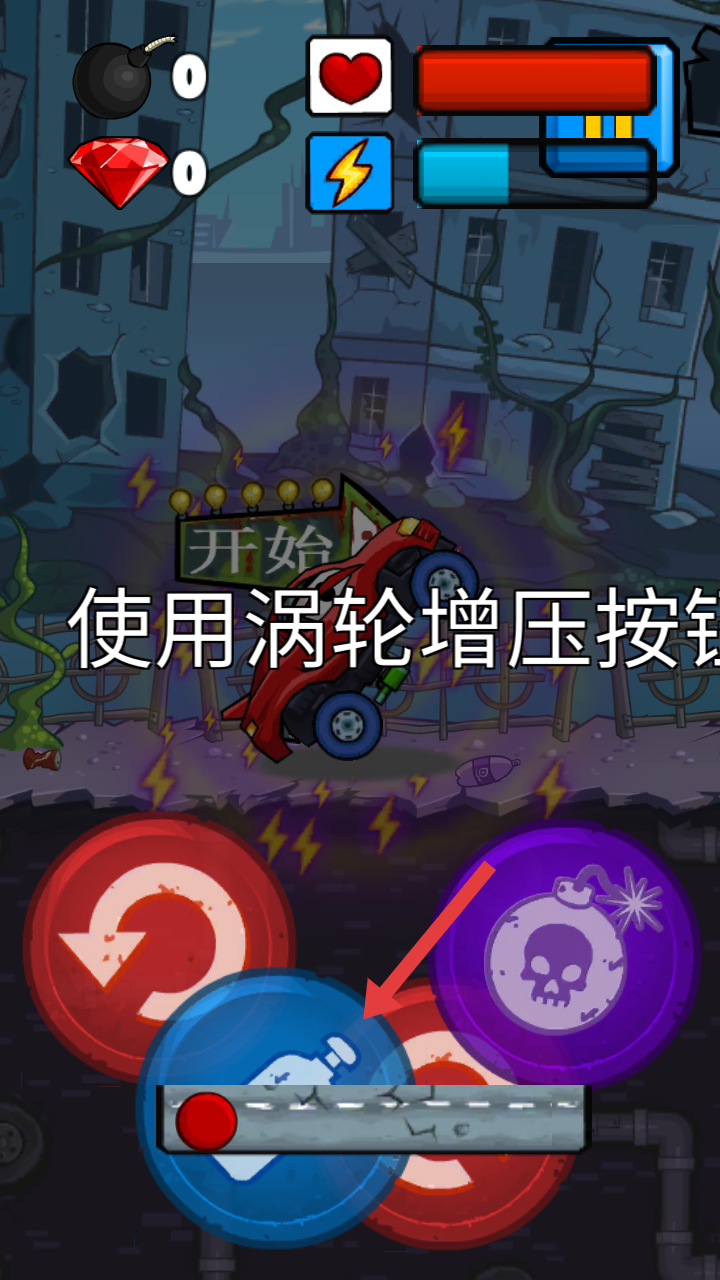 1、游戏开局后,需要点击下面的蓝色涡轮增压按钮,帮助我们的红色赛车快速启动,应对起始路段挑战。