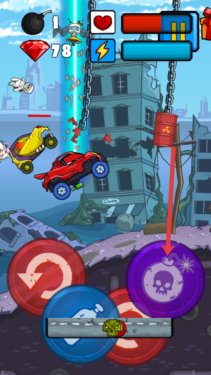 3、如果遭遇阻碍或者其他选手阻扰时,可以选择点击紫色炸弹的按钮,来释放攻击清除障碍,继续前进。