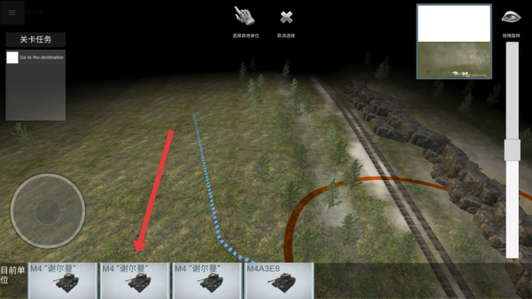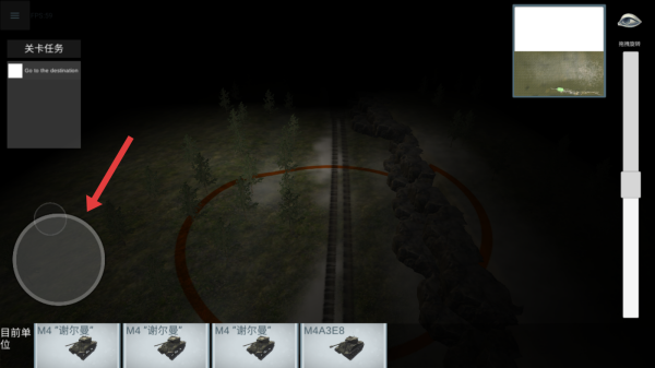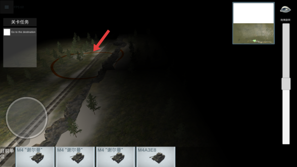 1、进入关卡,查看关卡任务为Go to the destination,借助小地图右上角,通过左侧轮盘操控部队,沿铁路方向推进。