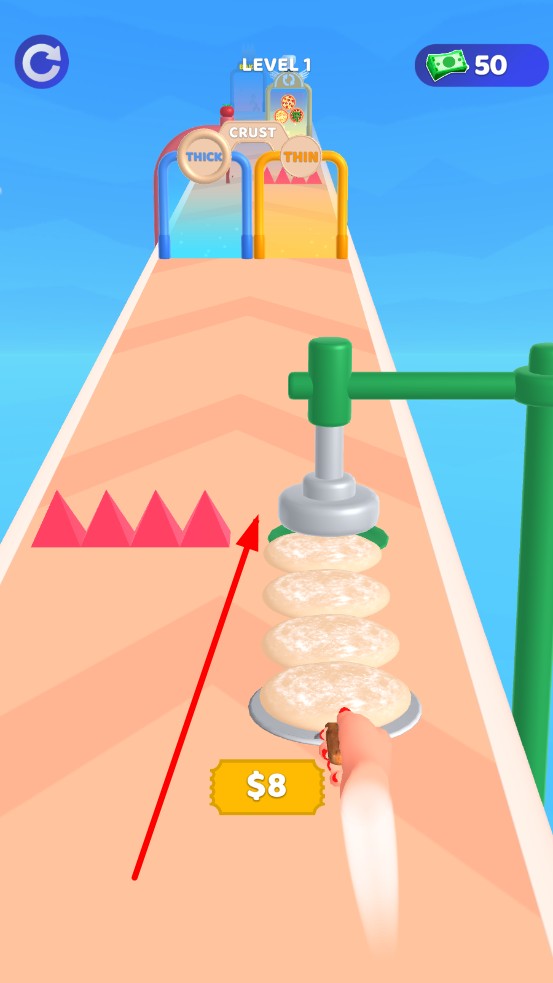 1、进入跑酷关卡,单指左右滑动控制披萨移动,抉择薄底通道,规避尖刺、旋转锯片陷阱,经压面机塑形、配料区,抓取榴莲等特色食材。