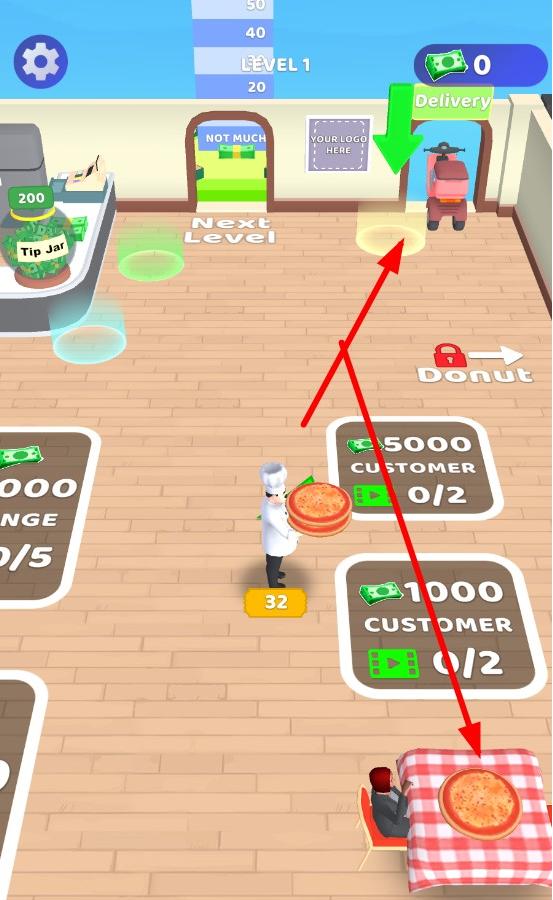 2、加工完成后进入餐厅,将披萨摆上格子餐桌,接待堂食顾客,和外卖订单派骑手配送,完成订单赚取金币与五星满意度。