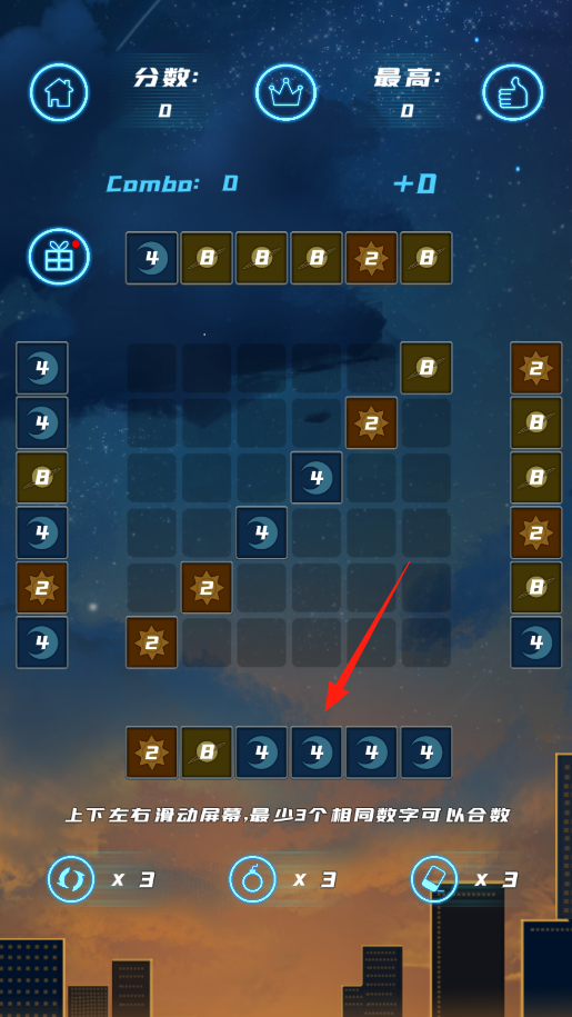 2、进入游戏界面,屏幕有很多带数字的方块,按照提示,滑动下方相同数字的方块,把它们合成更大的数,就像搭积木,凑够数量的同数方块,一滑就合并,看能合成多高的分数。