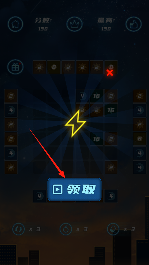 3、合成数字后,出现闪电特效和领取按钮,点这按钮看个广告就能拿奖励,奖励能用来解锁新道具或者提升合成效率,不想看广告,也能继续玩。