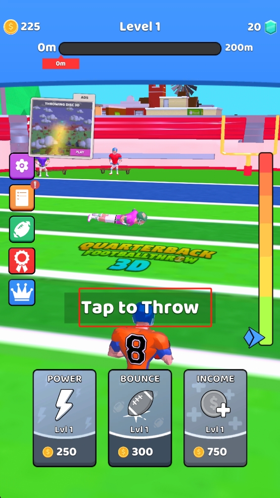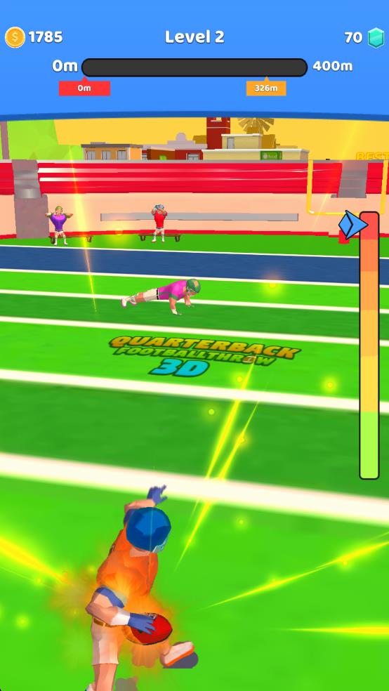 1、开局我们长按蓄力控制投掷的力度,然后在右侧能量条到最高的时候松开手指,即可将橄榄球投出,争取更远距离。