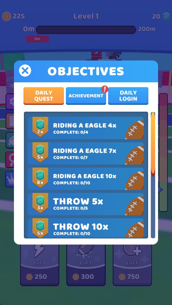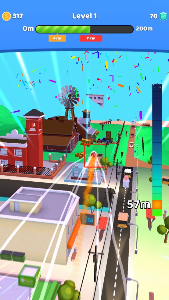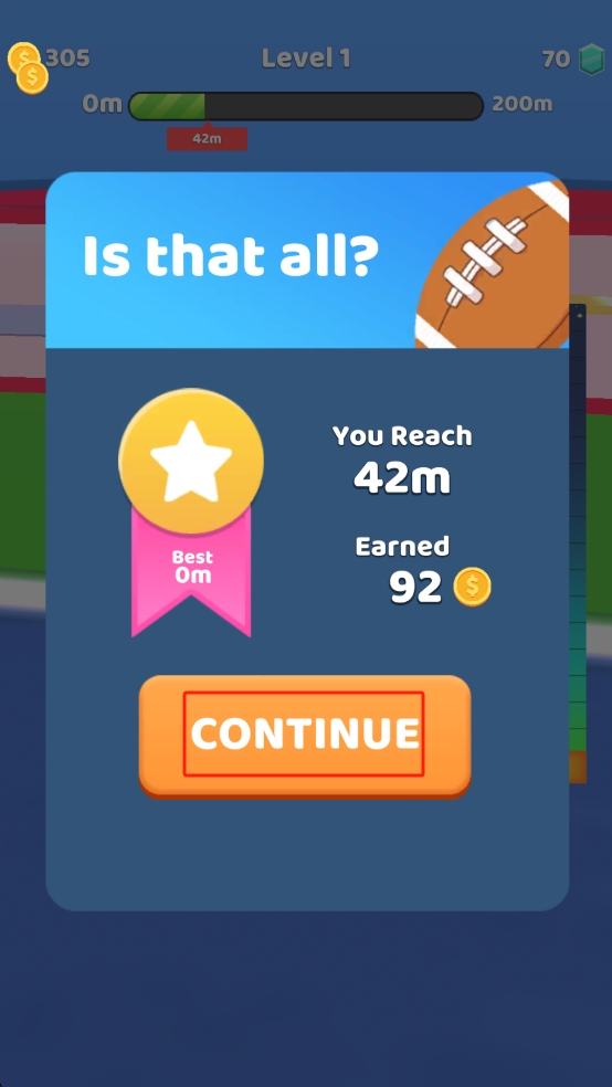 2、橄榄球飞行中,会经过城市场景,避开建筑等障碍,借助弹射效果延长飞行距离,积累金币。