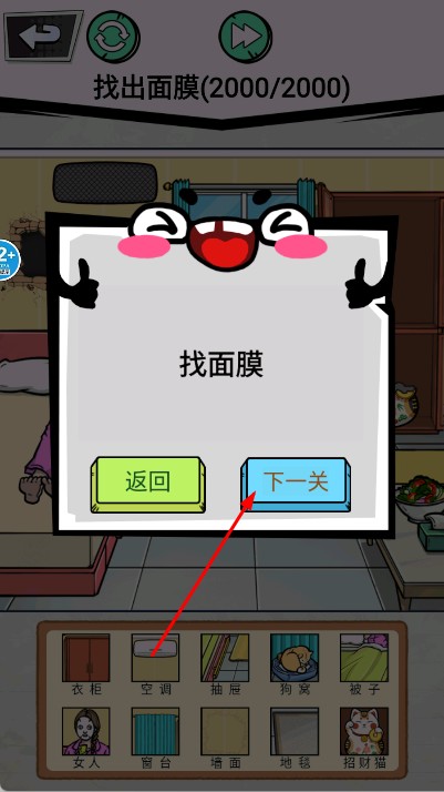 3、集满指定数量面膜,界面弹出通关提示,点击下一关,继续挑战新关卡。