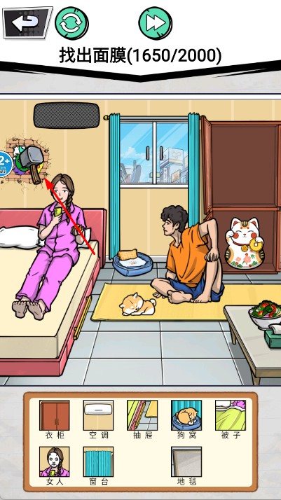 2、依据找出面膜任务,点击场景中隐藏的面膜,如人物周围、衣柜、窗台等位置,逐步累积数量。