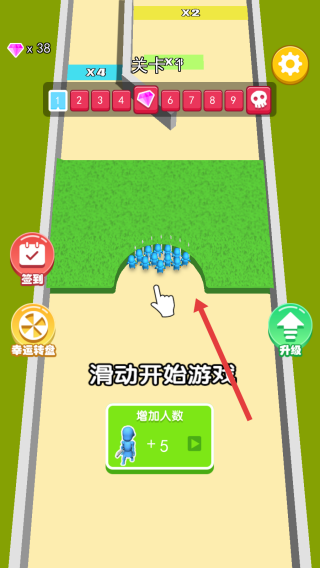 1、进入关卡,点击增加人数提升蓝色小兵数量,滑动屏幕滑动开始游戏,让小兵沿路径前进。