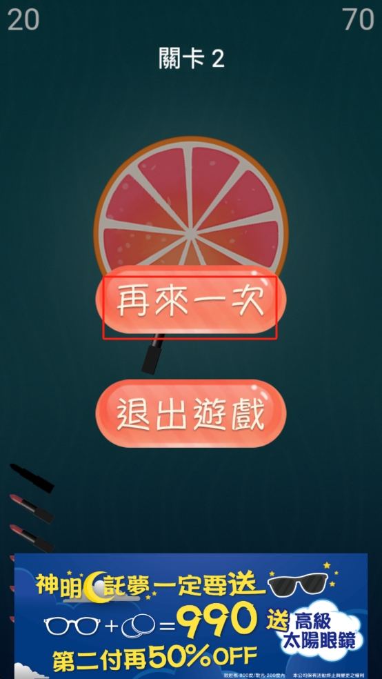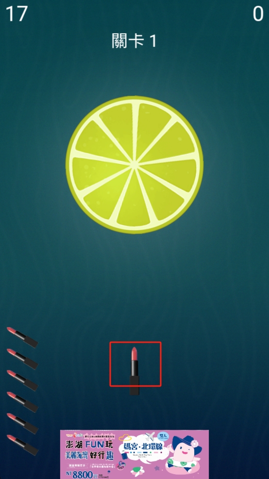 1、关卡1时,点击下方红色口红,控制投掷力度与角度,将口红投向柠檬切片,尽量命中切片区域得分。
