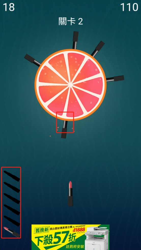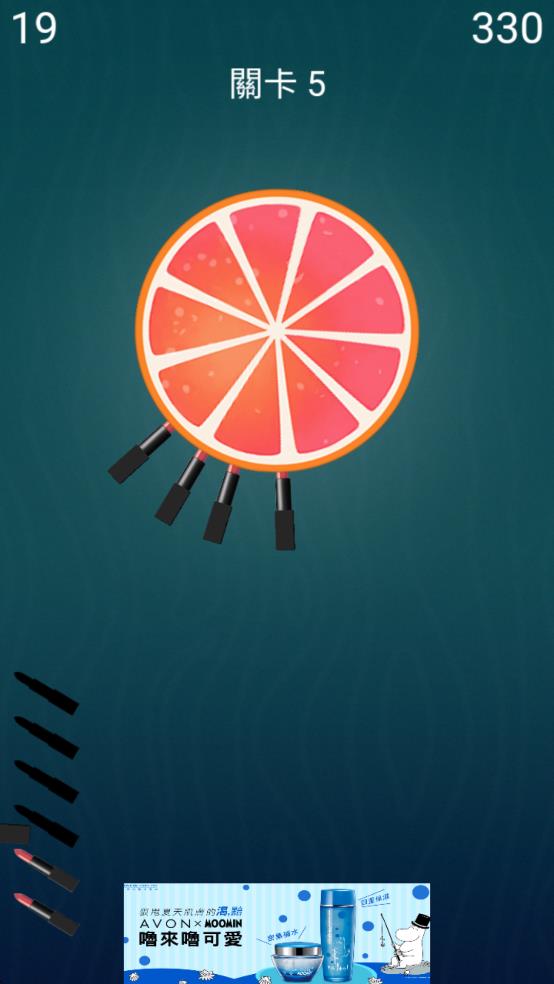 2、关卡2中,选取左侧黑色口红,瞄准西柚切片上的空位投掷,让口红插入切片,完成投掷任务。