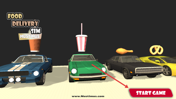 1、在Food Delivery Sim主界面选车辆,点击START GAME,进入停车场场景开启送餐任务。