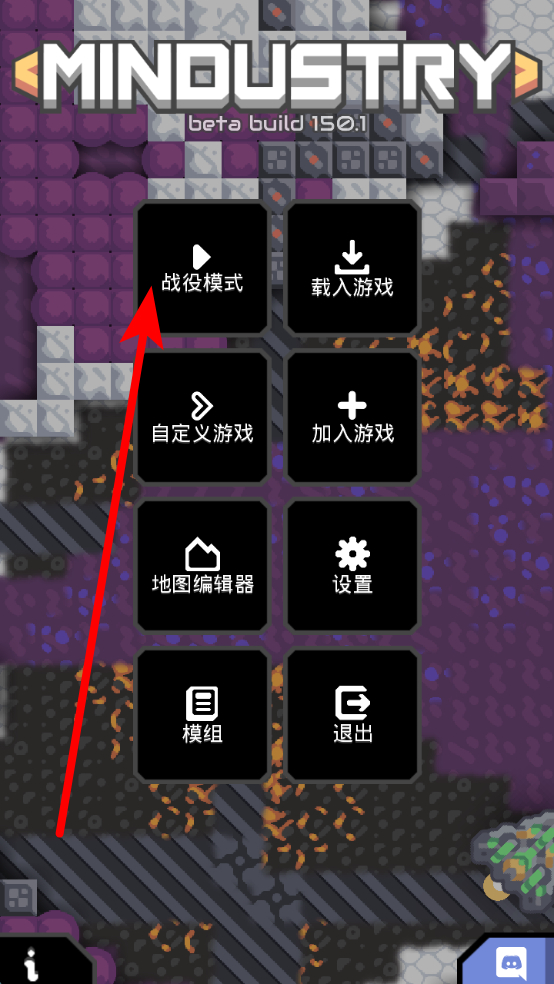 1、进入游戏主界面,看到MINDUSTRY标题及功能按钮,想体验主线剧情,点击战役模式按钮,开启战役挑战,后续可探索其他模式丰富玩法。
