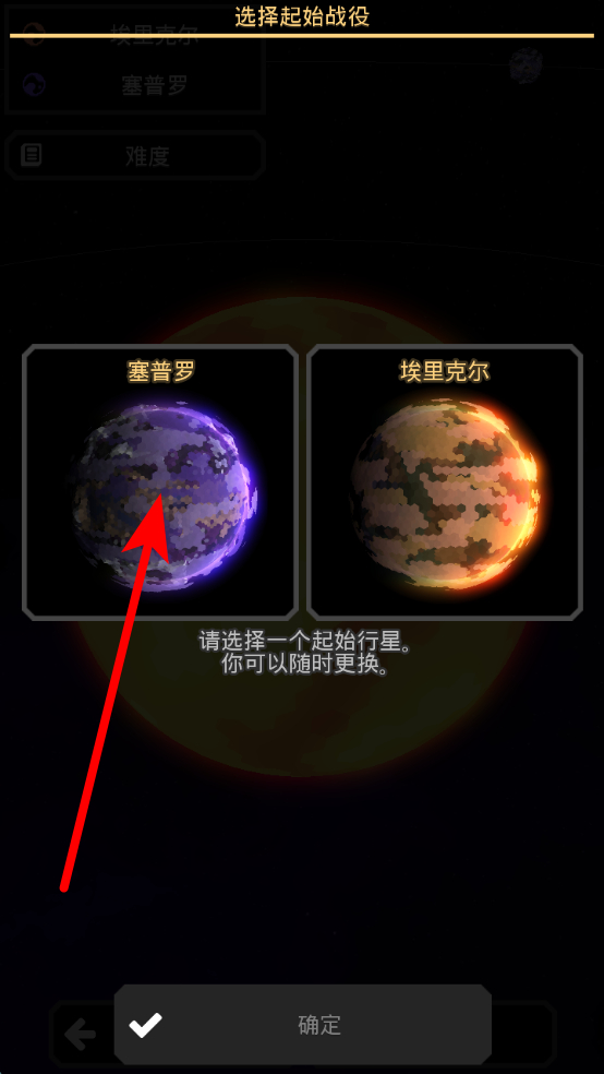 2、选择起始战役界面,有塞普罗埃里克尔两个起始行星可选,可先选塞普罗尝试,若想更换后续也能调整,选好后点击确定进入对应行星冒险。