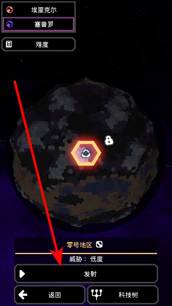 3、行星界面,确认所选行星及信息,零号地区威胁低度,点击发射按钮,前往该区域开始战斗与建设,逐步推进战役进程,开启星球探索之旅。