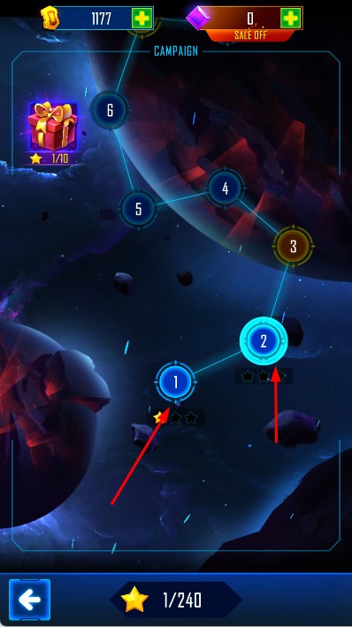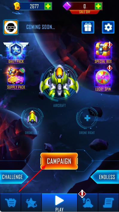 1、进入主界面,点击CAMPAIGN,选择关卡关卡1,开启射击挑战,在太空场景中,操控飞船移动。