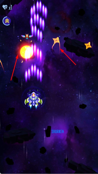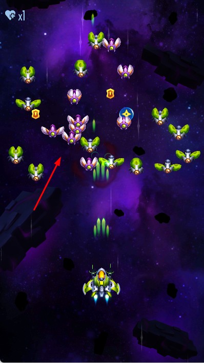 2、发射子弹攻击敌方外星人,躲避障碍物与敌人弹幕,收集场景中的金币、道具。