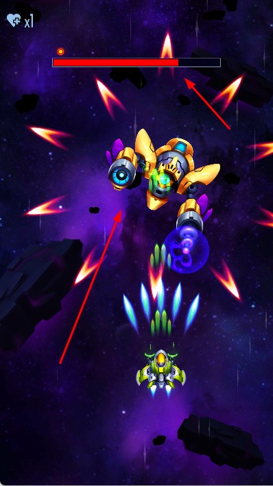 1、弹幕对抗即时反馈:射击命中的火花特效、敌机爆炸的碎片飞溅、道具拾取的增益提示,多感官同步传递战斗快感,强化操作成就感。