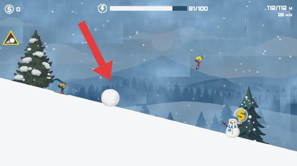 2、在滑雪时,会遇到一些特殊的道具以及障碍物,当雪球滑下来时需要点击跳跃进行躲避。