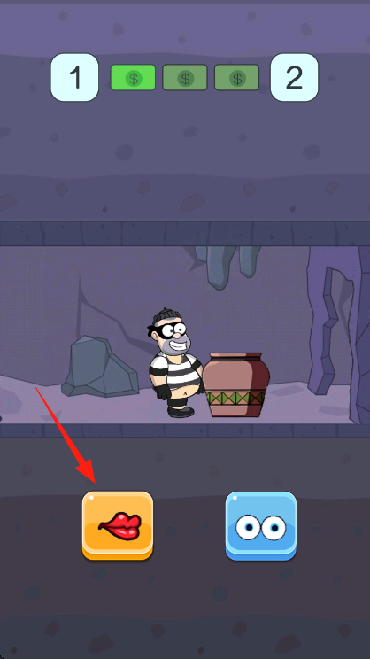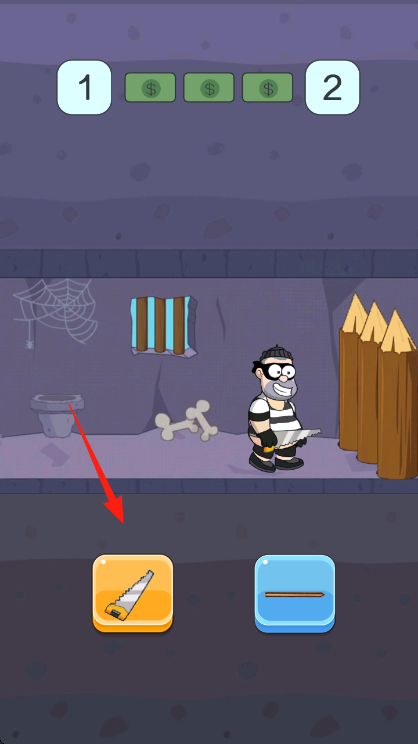 3、按需点道具锯子、嘴唇,解场景谜题锯木桩、开陶罐,收集资源,完成1→2关卡,解锁新道具、场景,帮囚犯逃狱。