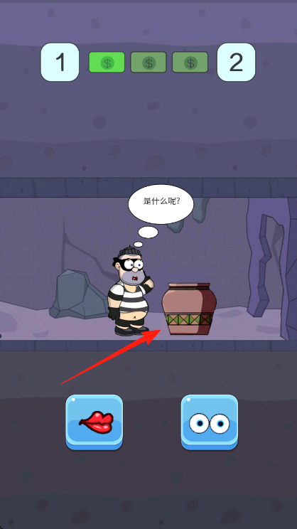 2、遇陶罐,选嘴唇道具,互动触发剧情,获取线索道具,用眼睛道具观察,找逃狱路径,避陷阱,推进关卡。