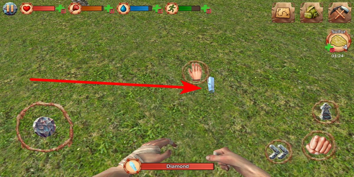 3、一旦发现地面存在可拾取物品,迅速点击手掌样式的拾取图标,获取资源续可灵活用于制作实用工具、建造庇护设施,全方位助力岛上生存。