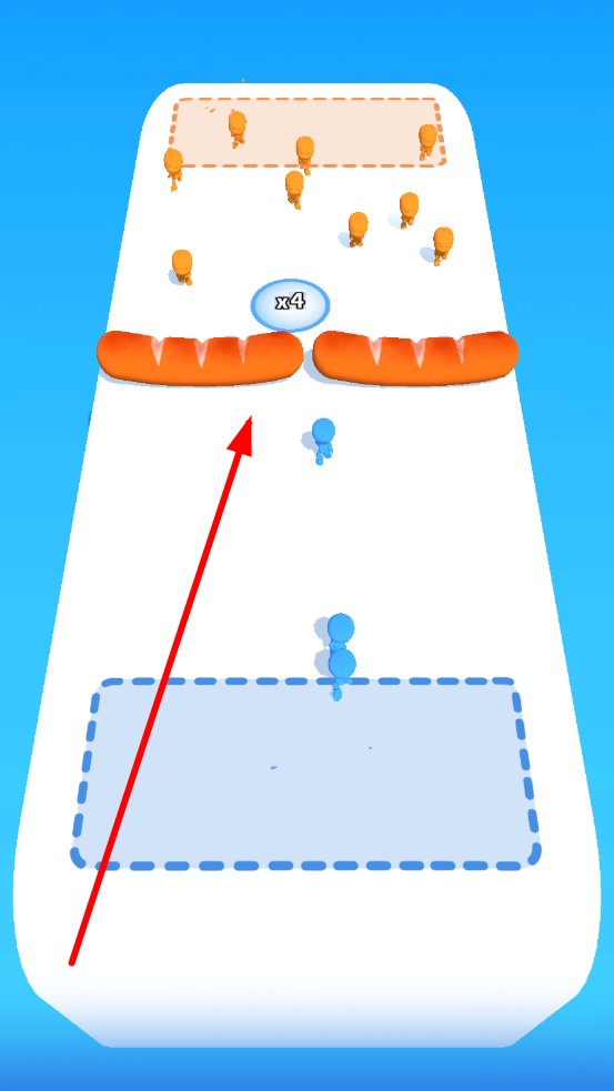 1、进入关卡后,点击蓝色框里,派出小人,推动热狗,将热狗推到敌方阵营中,即可获胜。