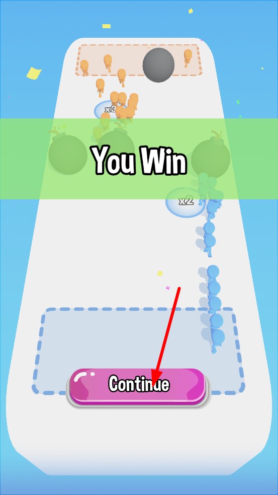 3、突破最后一道障碍后,全力围剿剩余橙色敌人,将其逼出顶部橙色区域,屏幕弹出You Win,底部浮现Continue按钮,点击后解锁新关卡。