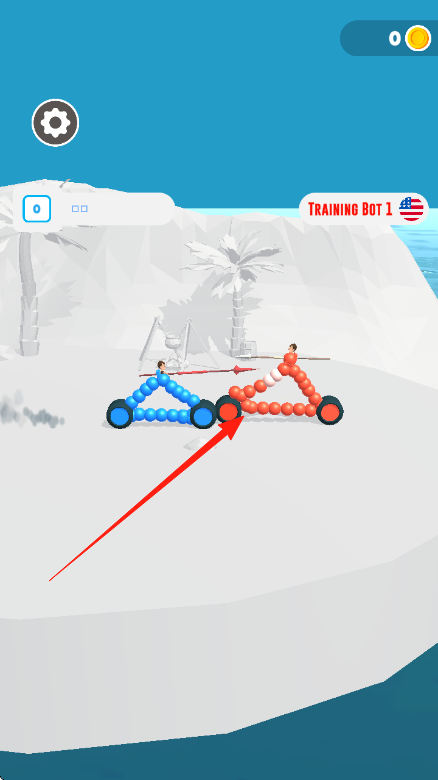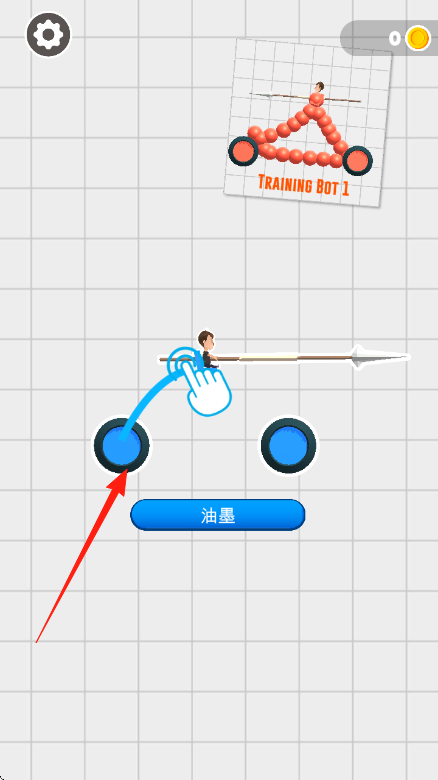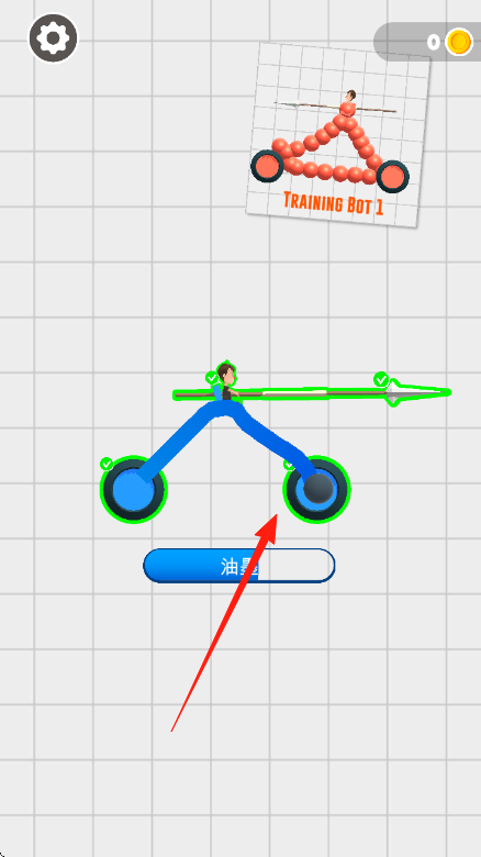 1、按指引拖蓝色节点连人物、轮子,搭战车结构,点油墨确认,参考TRAININGBOT1造型,确保稳固,完成造车,进入对战。