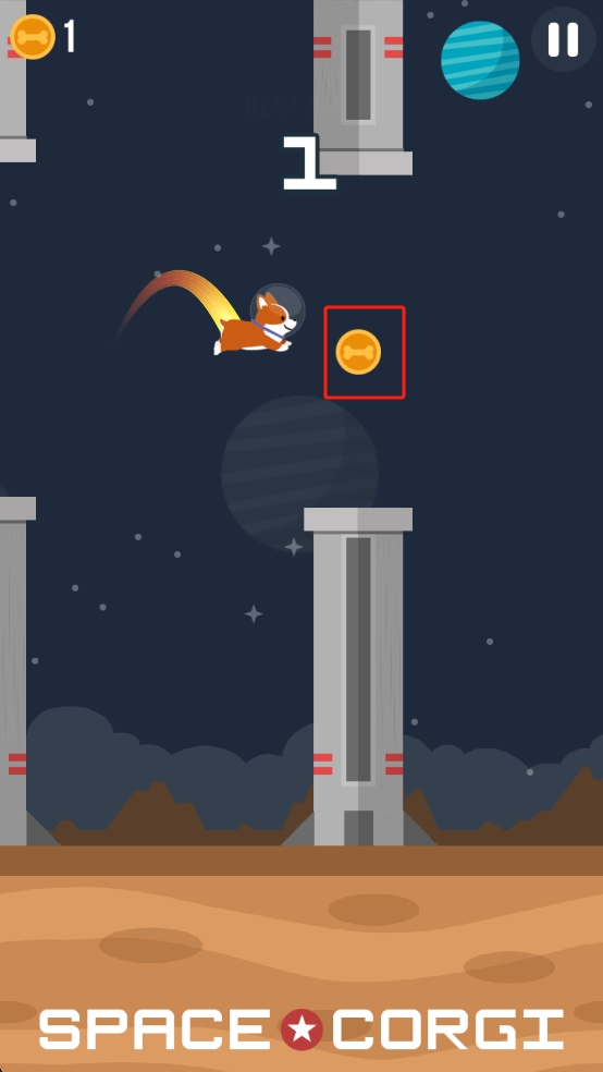 2、在荧光星球关卡中,小狗乘着飞行器掠过彩色陨石带,避开迎面而来的太空垃圾,同时收集关卡中的金币。