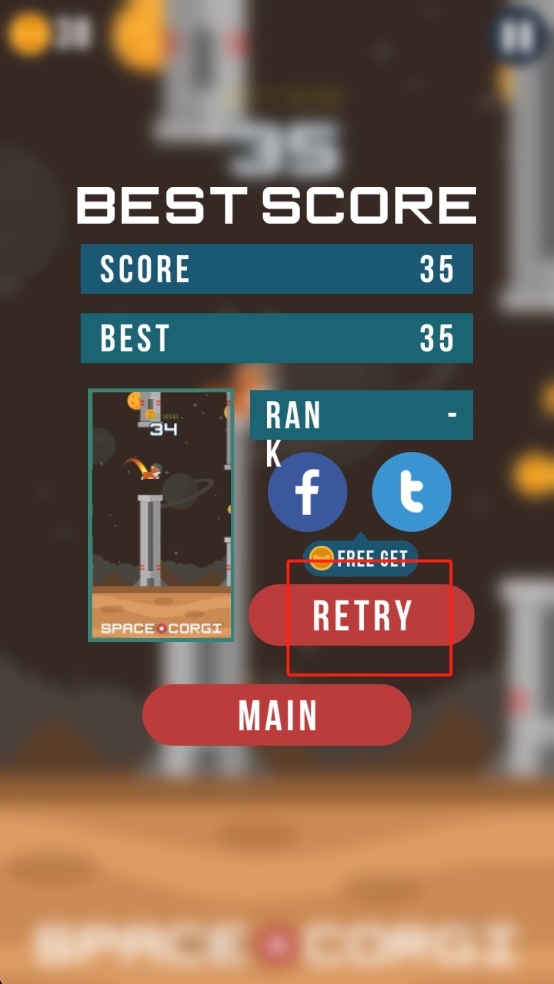 3、不慎掉落时游戏就结束了,得分结算后,若想重玩挑战更高分,点击RETRY按钮,重新开始太空跳跃之旅。