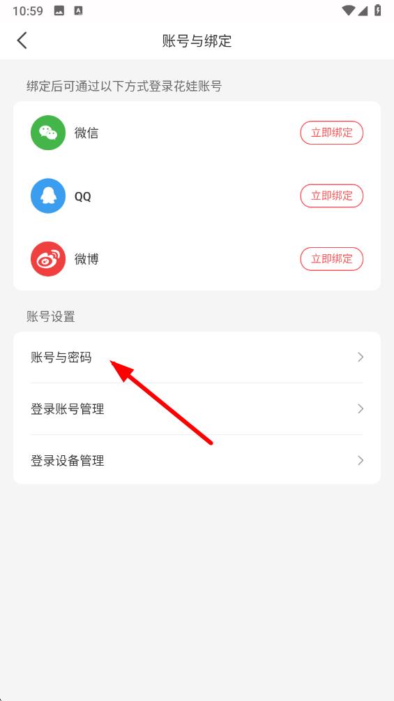3、在账号与绑定页面点击账号与密码,进入账号与密码设置页