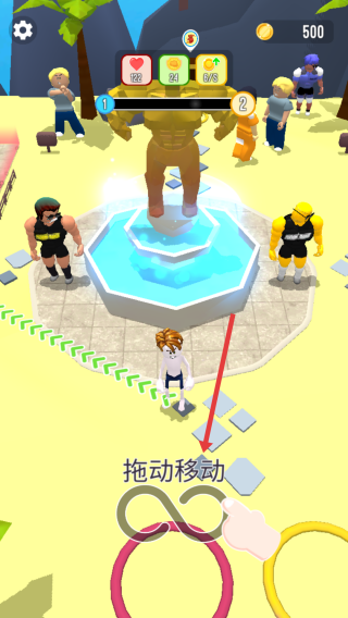 1、进入游戏初始场景,拖动底部来操控按钮移动角色,靠近金色雕像区域,触发健身成长引导。
